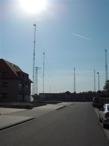 Overall view of the antennas of the sending startion in Middelkerke taken from the “Duinenweg” (the road of the dunes) with in the close view, the P1 and P7 masts of 65 m of TG2 antenna of the Z61 transmitter of medium wave (435 - 512 Khz) for the NAVTEX transmission on 518 Khz. |